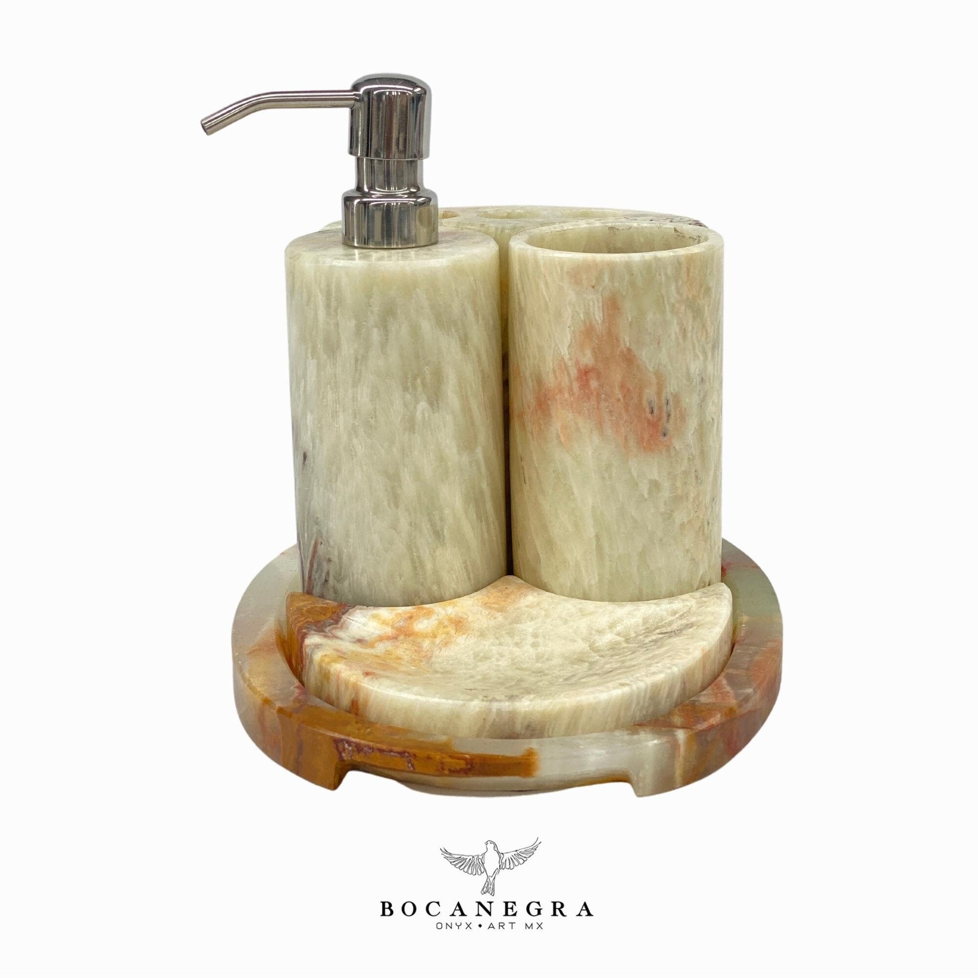Add a touch of elegance and add color to your bathroom with this beautiful Bathroom Set with soap dispenser and soap pump, handcrafted directly from Onyx stone by Mexican artisans.